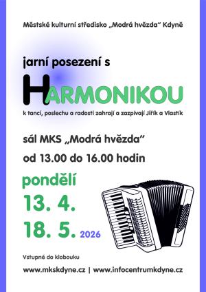 Městské kulturní středisko „Modrá hvězda“ v Kdyni zve všechny na hudební odpoledne s harmonikou. Přijďte si zatančit a poslechnout si příjemnou hudbu od 13.00 do 16.00 hodin, vstupné je dobrovolné do klobouku.