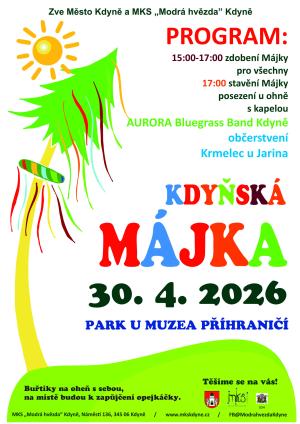 Kdyňská májka je již tradičním jarním setkáním u hudby, ohně, opékání buřtů a přátelské atmosféry. Přijďte s námi oslavit příchod jara tradičním způsobem! Od 15.00 hodin mohou návštěvníci v parku společně zdobit májku barevnými fáborky.